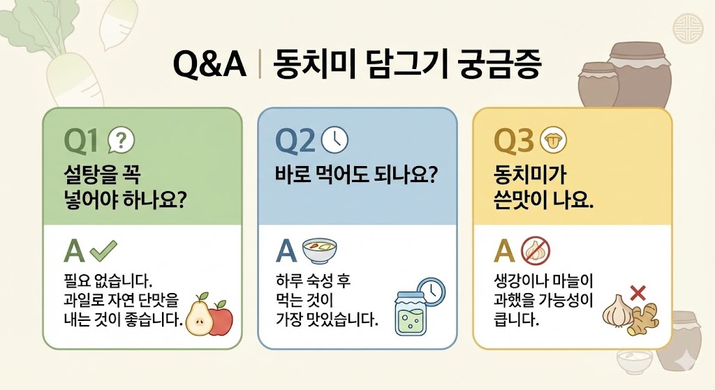 농촌진흥청과 김치 전문가들 역시 “동치미는 재료보다 비율과 위생이 맛을 좌우한다”고 강조합니다. 제대로만 담그면 시원하고 깔끔한 국물을 오랫동안 즐길 수 있습니다. 이 글을 끝까지 읽으면 동치미 담그기를 쉽게 해결할 수 있습니다.